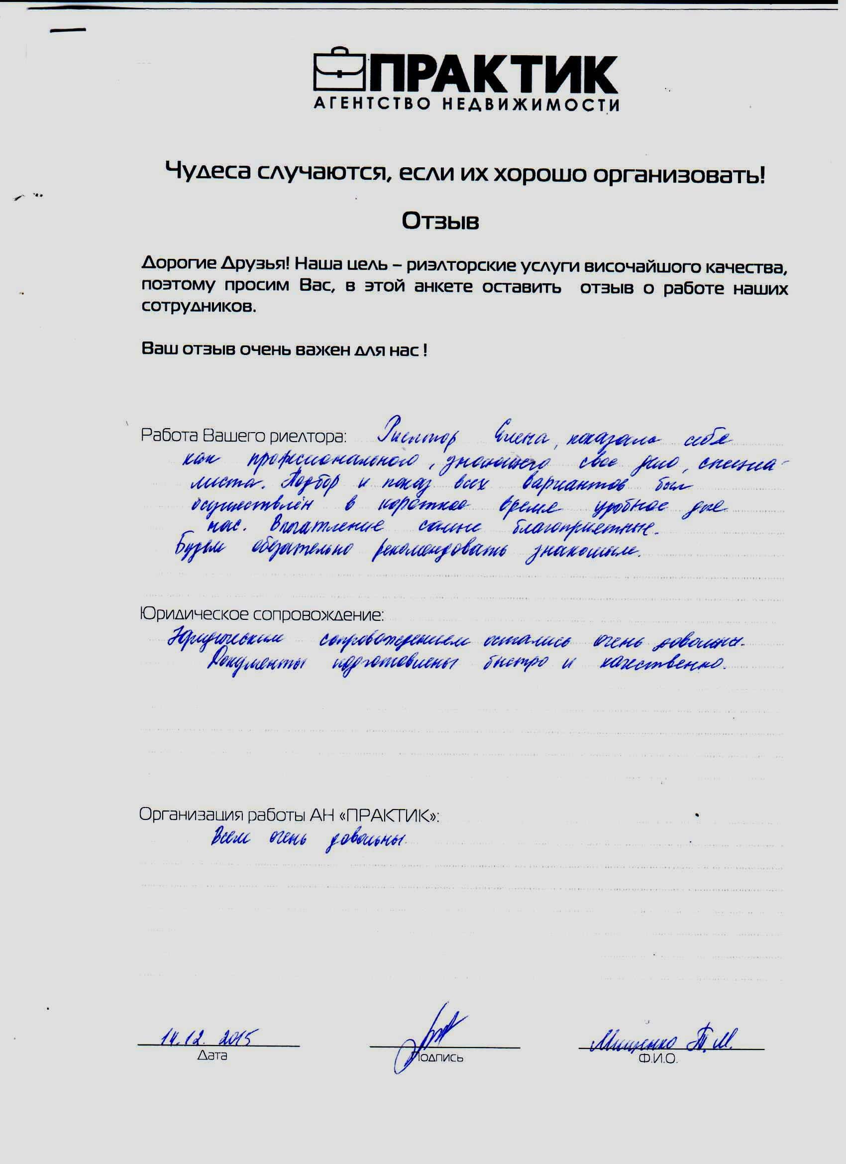 Відгук про роботу АН Практик від 14.12.2015 Мищенко Т.М.