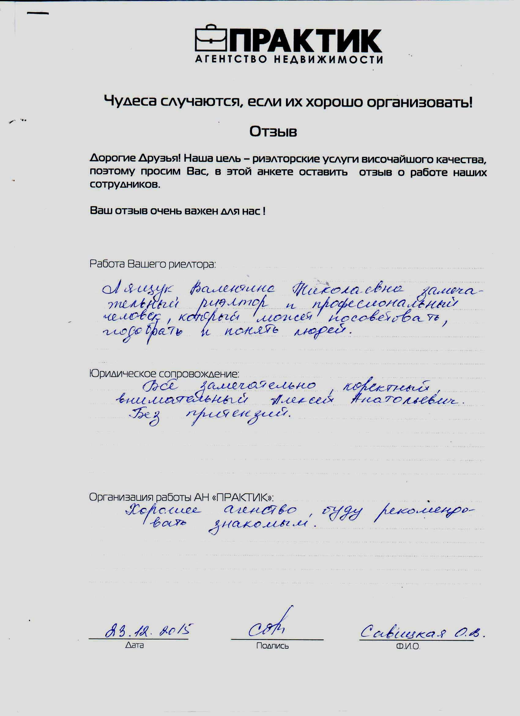 Відгук про роботу АН Практик від 23.12.2015 Савицкая О.В.