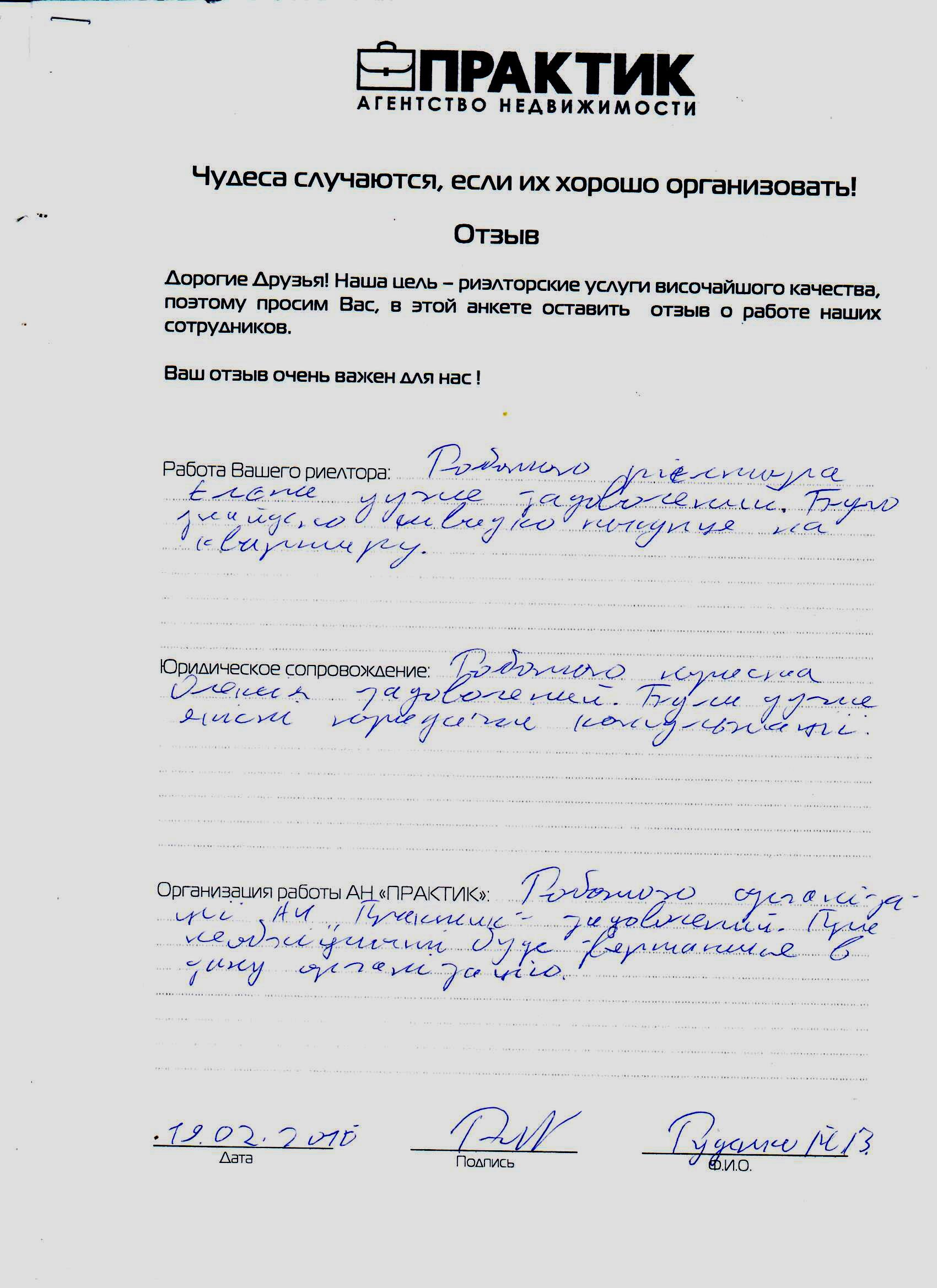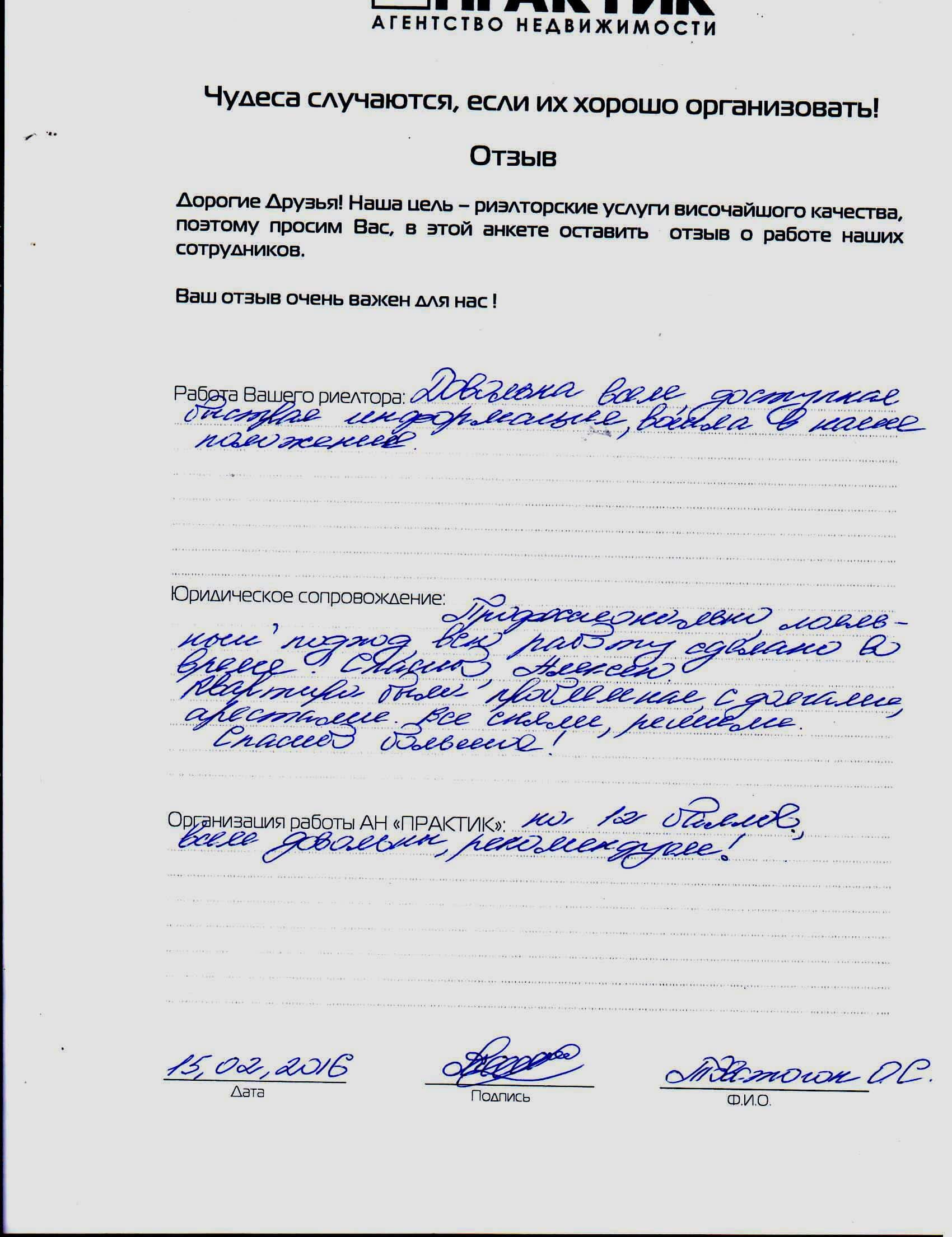 Відгук про роботу АН Практик від 15.02.2016 Товстоног О.С.