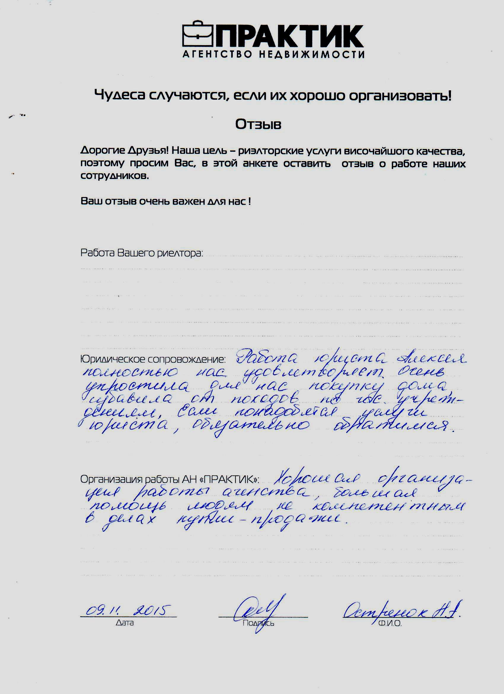 Відгук про роботу АН Практик від 09.11.2015 Остренок Н.А.
